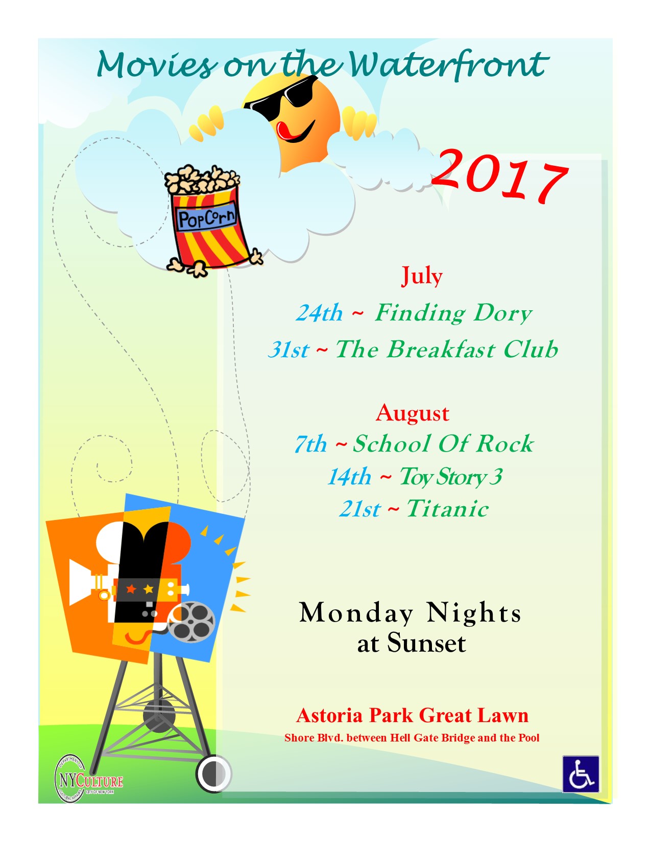 The Central Astoria Local Development Coalition invites everyone to its 2017 Movies On The Waterfront Series, Monday evenings at sunset (approximately 8:30 pm) at the Astoria Park Great Lawn on Shore Blvd between the Hell Gate Bridge & the pool. These free movies are open to the public, and no rsvp or tickets are required. Just show up! – July 24th – Finding Dory – July 31st – The Breakfast Club – August 7th- School Of Rock – August 14th – Toy Story 3 – August 21st – Titanic We look forward to seeing you there!!!