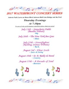 The Central Astoria Local Development Coalition invites everyone to its 2017 Waterfront Concert Series, Thursday evenings at 7:30 pm at the Astoria Park Great Lawn on Shore Blvd between the (...)